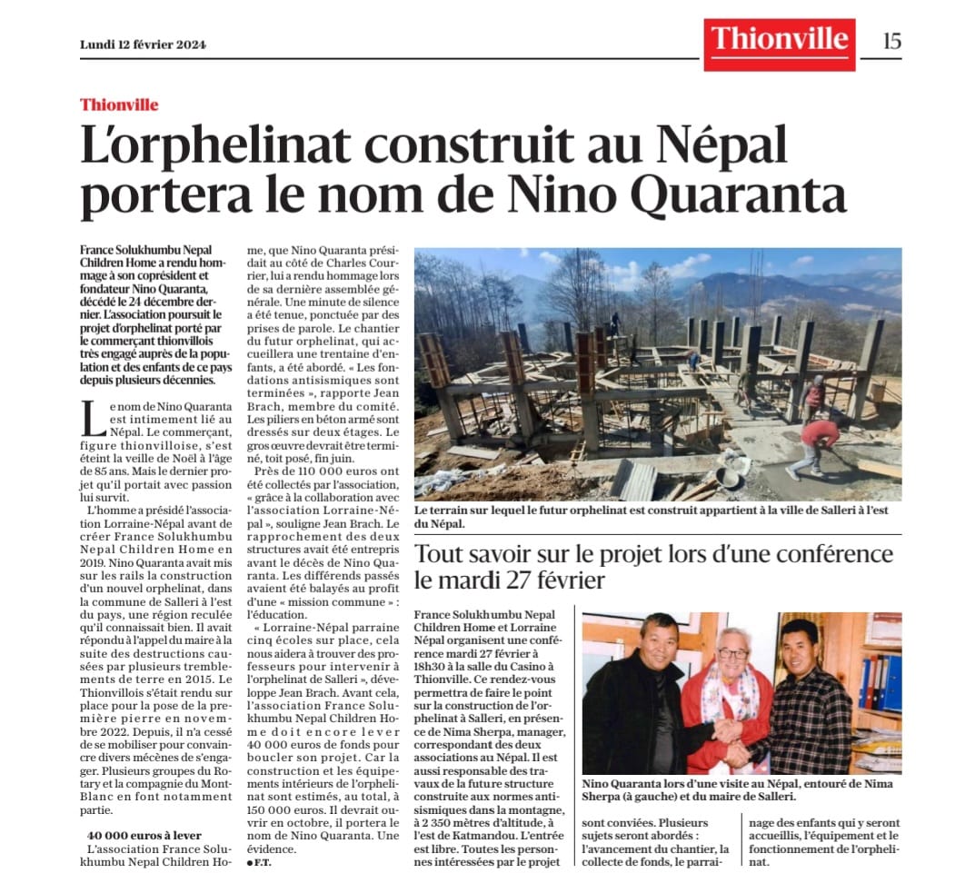 L’homme a présidé l’association Lorraine-Népal avant de créer France Solukhumbu Nepal Children Home en 2019. Nino Quaranta avait mis sur les rails la construction d’un nouvel orphelinat, dans la commune de Salleri à l’est du pays, une région reculée qu’il connaissait bien. Il avait répondu à l’appel du maire à la suite des destructions causées par plusieurs tremblements de terre en 2015. Le Thionvillois s’était rendu sur place pour la pose de la première pierre en novembre 2022. Depuis, il n’a cessé de se mobiliser pour convaincre divers mécènes de s’engager. Plusieurs groupes du Rotary et la compagnie du Mont-Blanc en font notamment partie.