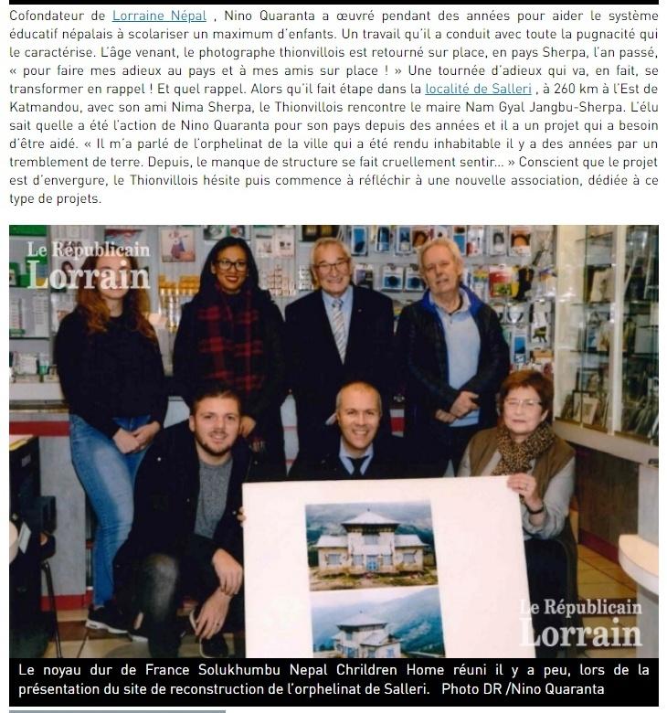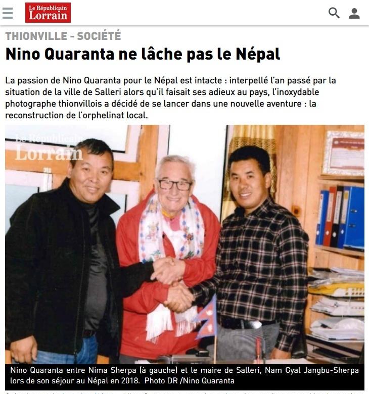 Cofondateur de Lorraine Népal , Nino QUARANTA a œuvré pendant des années pour aider le système éducatif népalais à scolariser un maximum d’enfants. Un travail qu’il a conduit avec toute la pugnacité qui le caractérise. L’âge venant, le photographe thionvillois est retourné sur place, en pays SHERPA, l’an passé, « pour faire mes adieux au pays et à mes amis sur place ! » Une tournée d’adieux qui va, en fait, se transformer en rappel ! Et quel rappel. Alors qu’il fait étape dans la localité de Salleri , à 260 km à l’Est de Katmandou, avec son ami Nima SHERPA, le Thionvillois rencontre le maire Nam Gyal Jangbu SHERPA. L’élu sait quelle a été l’action de Nino QUARANTA pour son pays depuis des années et il a un projet qui a besoin d’être aidé. « Il m’a parlé de l’orphelinat de la ville qui a été rendu inhabitable il y a des années par un tremblement de terre. Depuis, le manque de structure se fait cruellement sentir… » Conscient que le projet est d’envergure, le Thionvillois hésite puis commence à réfléchir à une nouvelle association, dédiée à ce type de projets.