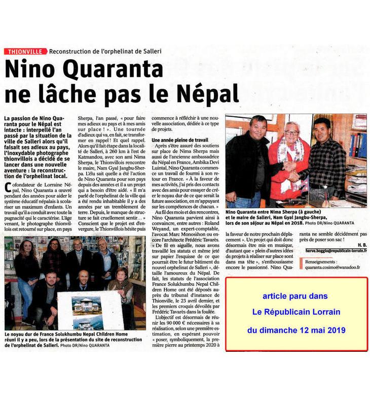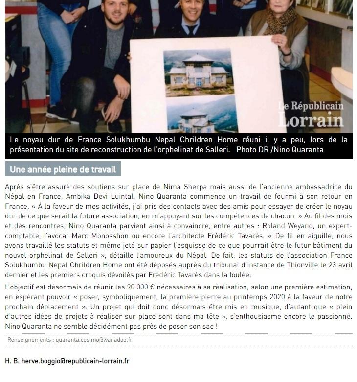 « Lorraine-Népal parraine cinq écoles sur place, cela nous aidera à trouver des professeurs pour intervenir à l’orphelinat de Salleri », développe Jean Brach. Avant cela, l’association France Solukhumbu Nepal Children Home doit encore lever 40 000 euros de fonds pour boucler son projet. Car la construction et les équipements intérieurs de l’orphelinat sont estimés, au total, à 150 000 euros. Il devrait ouvrir en octobre, il portera le nom de Nino Quaranta. Une évidence.